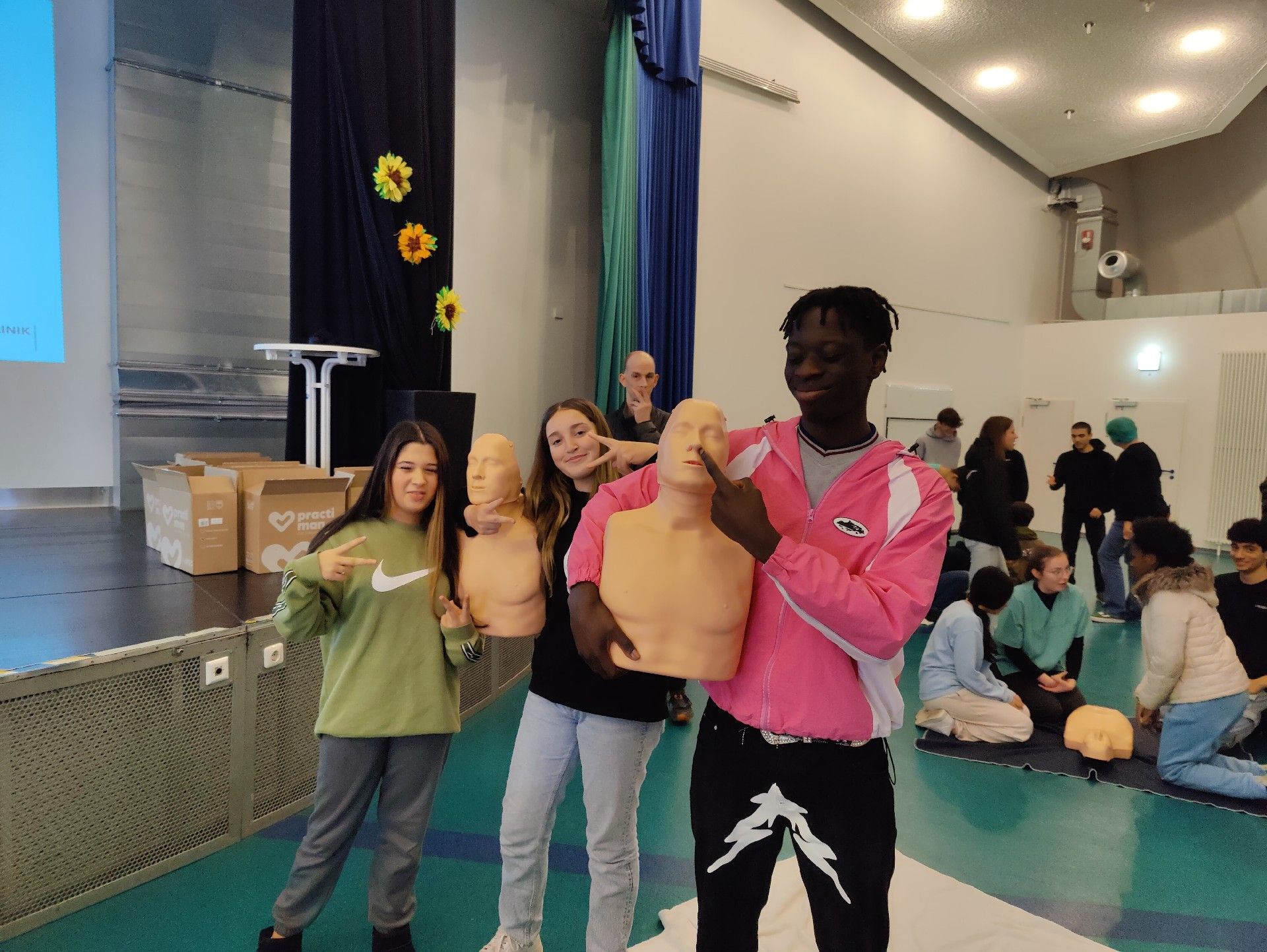 Schülerinnen und Schüler, Lehrerinnen und Lehrer üben gemeinsam die Formel zur Wiederbelebung