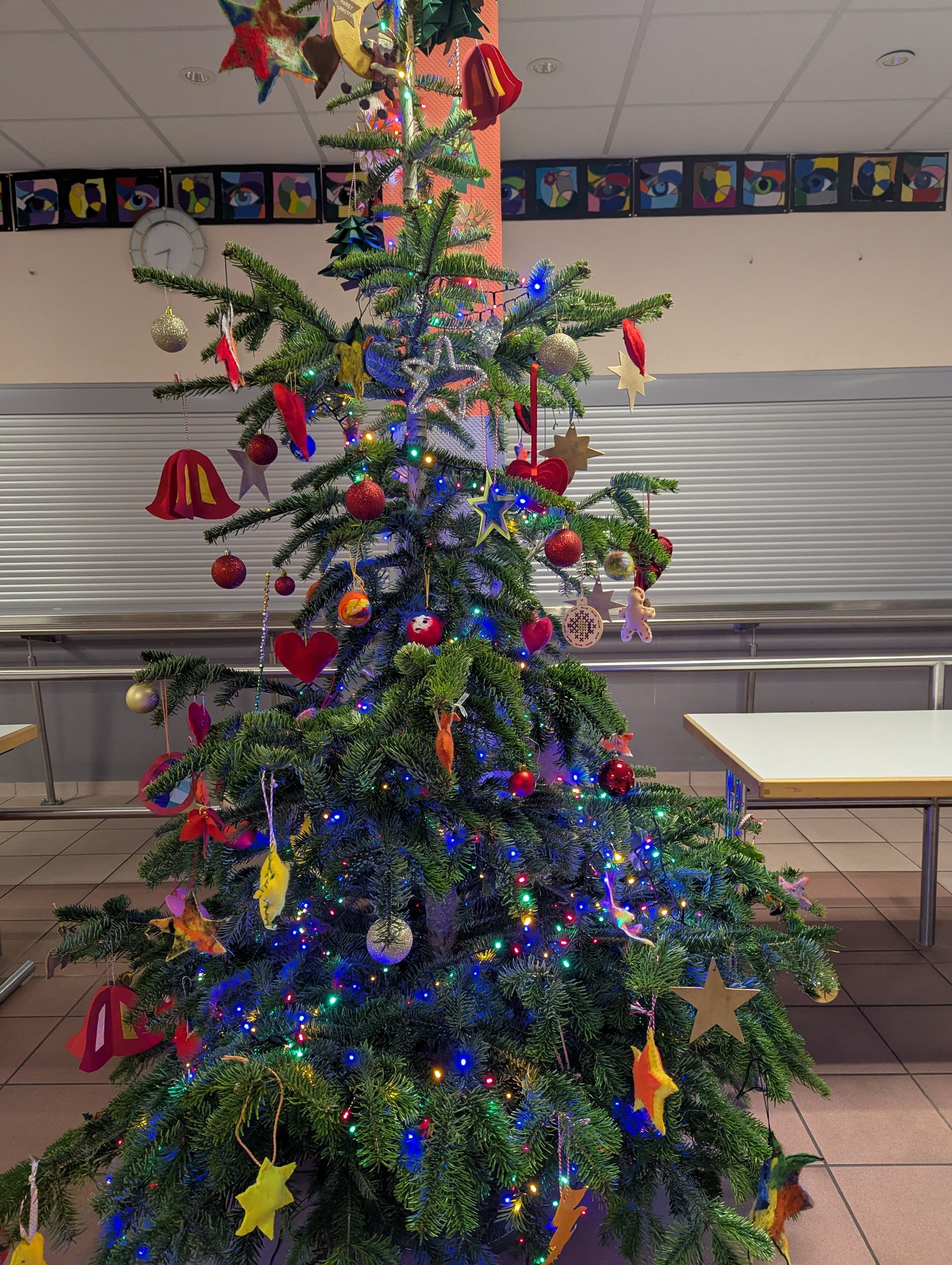 Weihnachtsbaum in der Mensa: Toll geschmückt dank der Klasse 6a